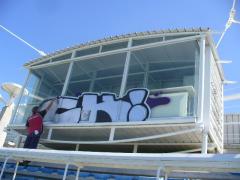 Graffiti Tags removed from commentator glass booth by G.R.S