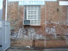 Graffiti Tags and white enamel painted sign removed from face brick by G.R.S
