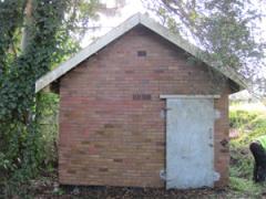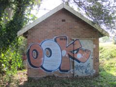 Graffiti SAC shield on sandstone tile, treatment on left part