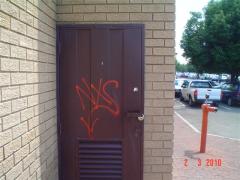 Graffiti Tag removed from brown exit door by G.R.S